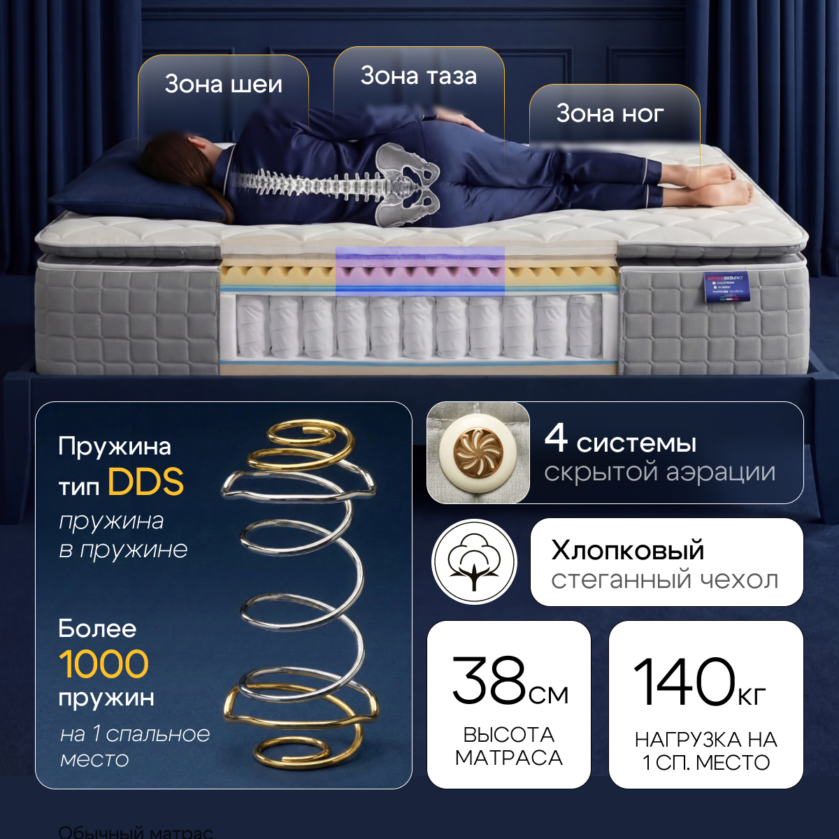 Панель «Pillow-Top»Более 700 пружинв двуспальном матрасеБолее 350 пружинв односпальномОколо 38 сммаксимальная высота по центру