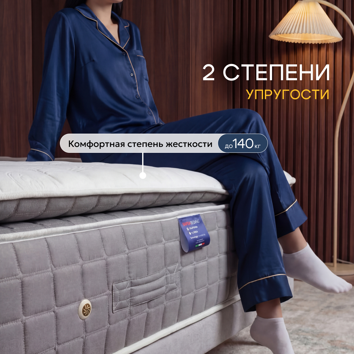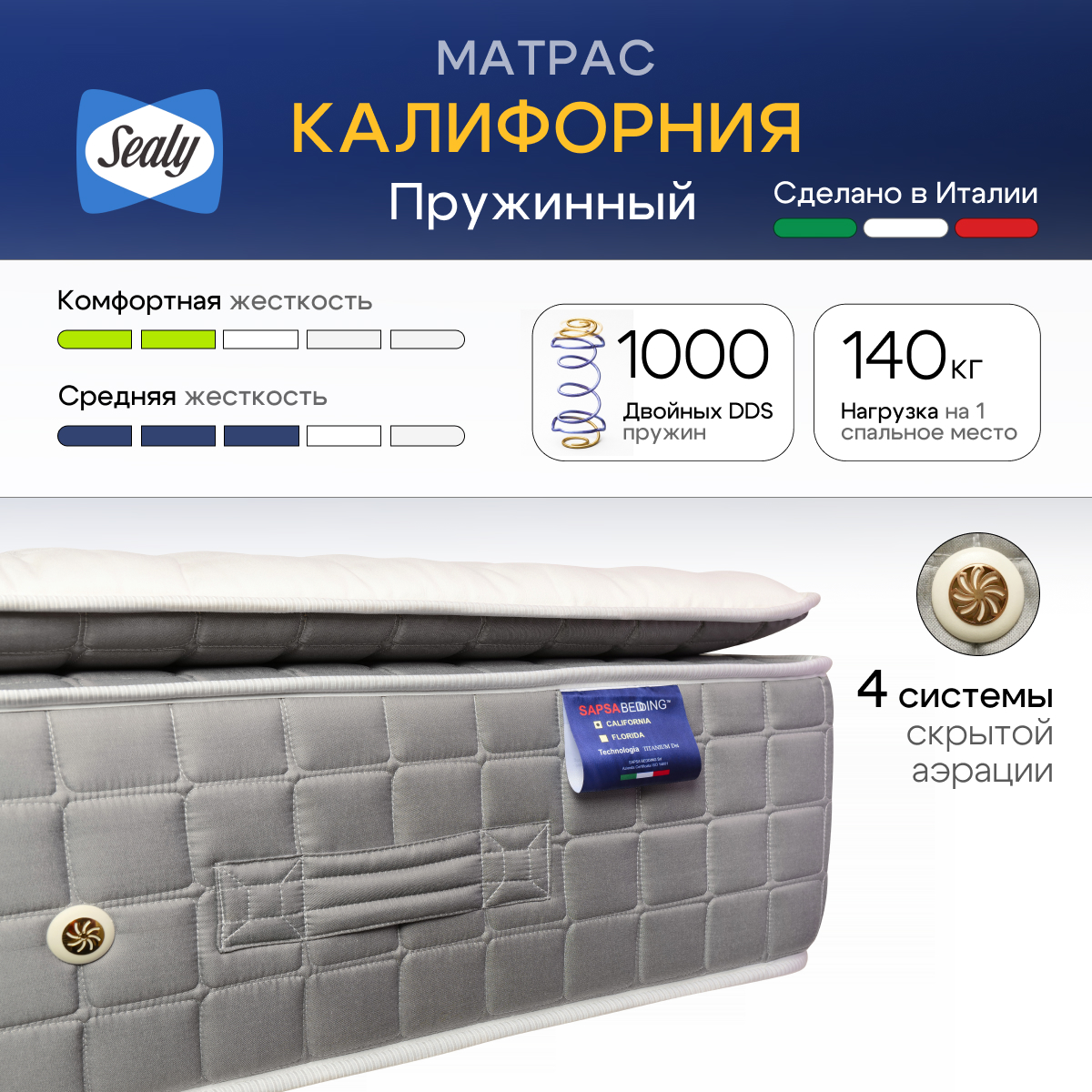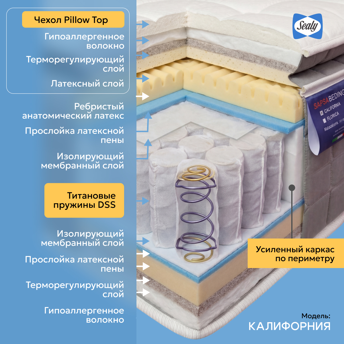 Матрас California оснащен верхней панелью Pillow Top с многослойной прослойкой. Сочетание Pillow Top и пружинной системы Dual Support System обеспечивает лучшую мягкость и поддержку среди всех моделей Sapsa Bedding.