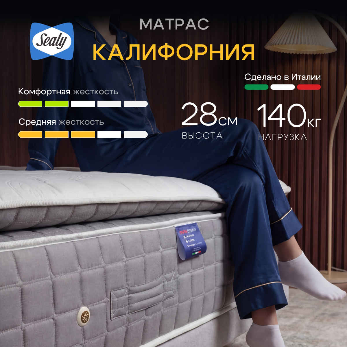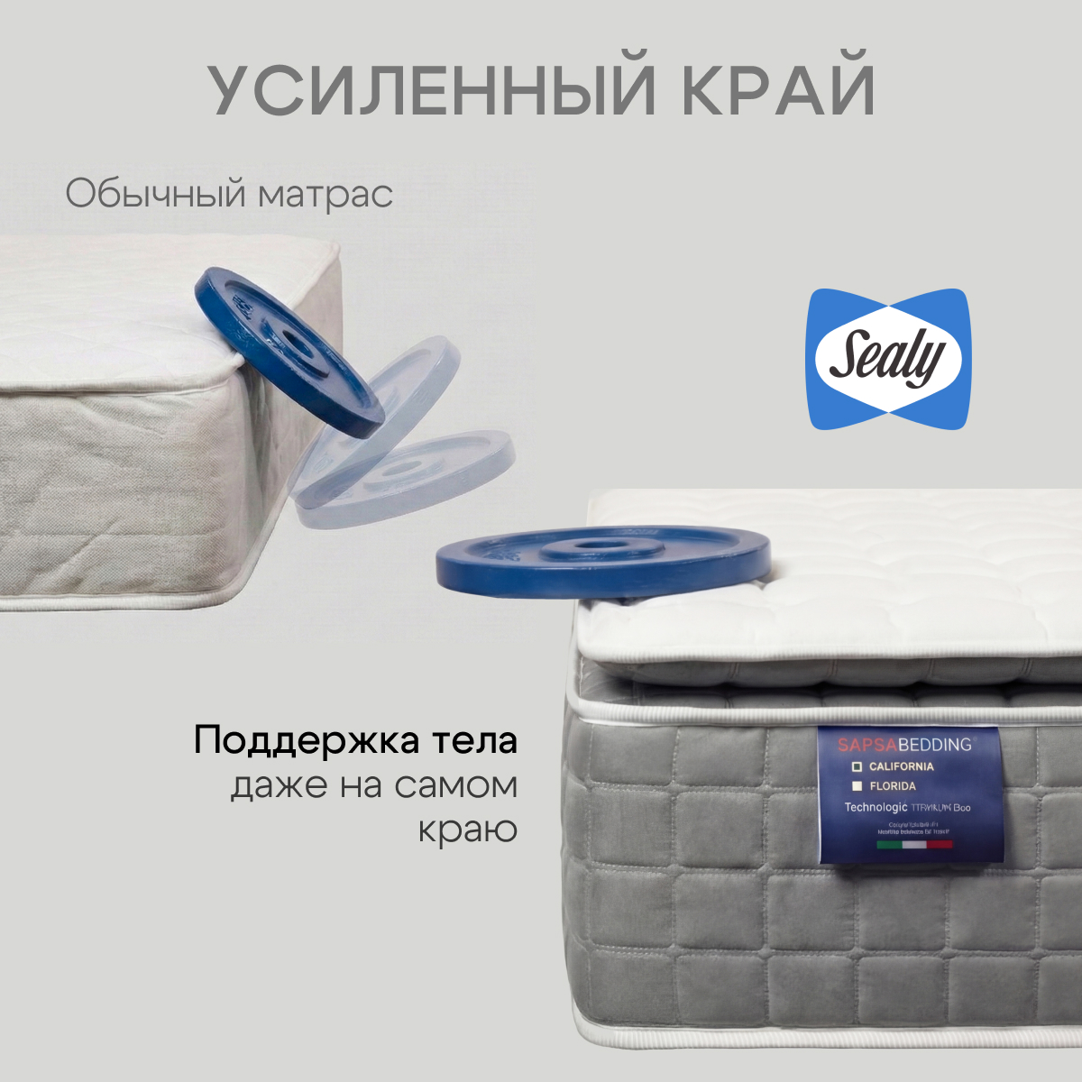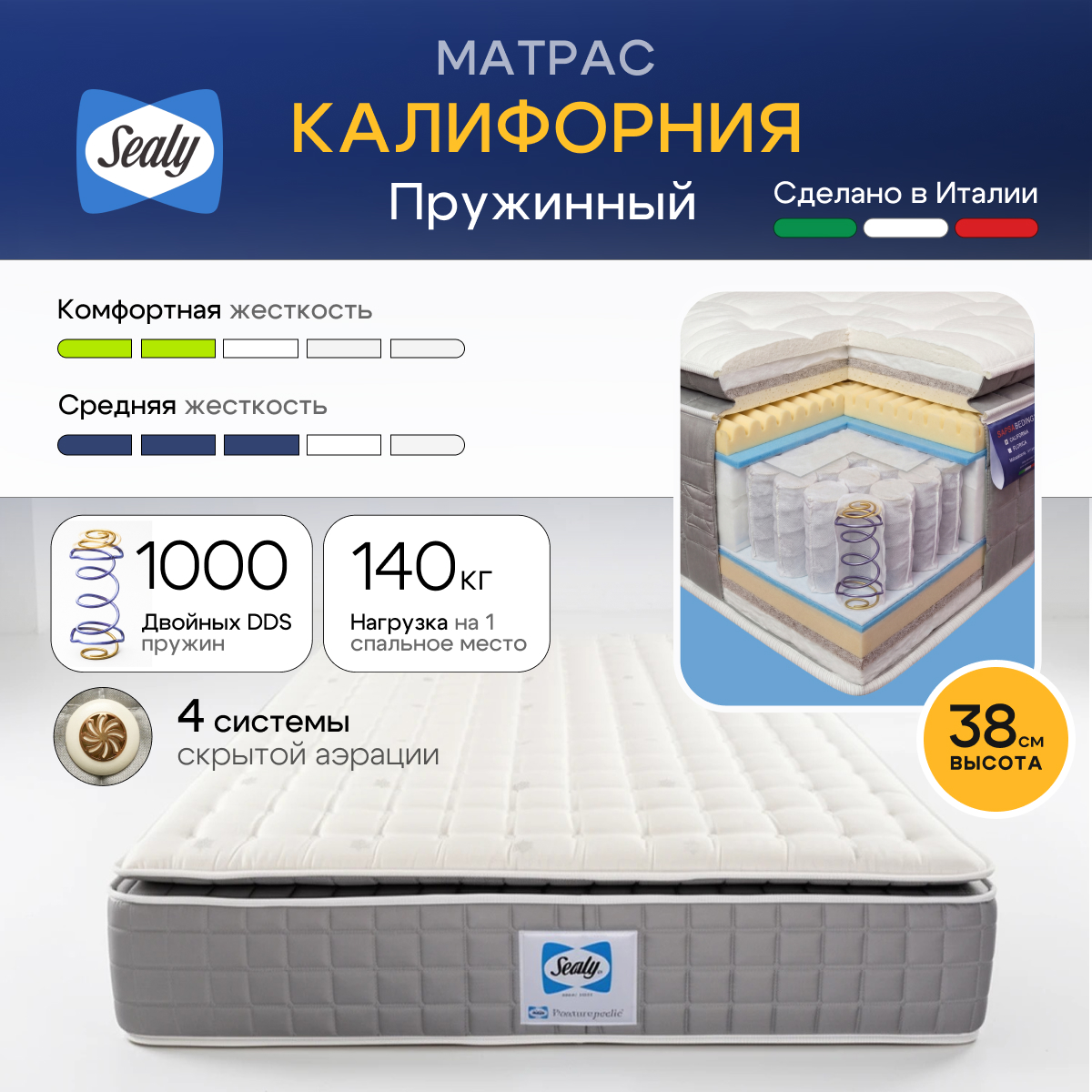 Матрас California оснащен верхней панелью Pillow Top с многослойной прослойкой. Сочетание Pillow Top и пружинной системы Dual Support System обеспечивает лучшую мягкость и поддержку среди всех моделей Sapsa Bedding.